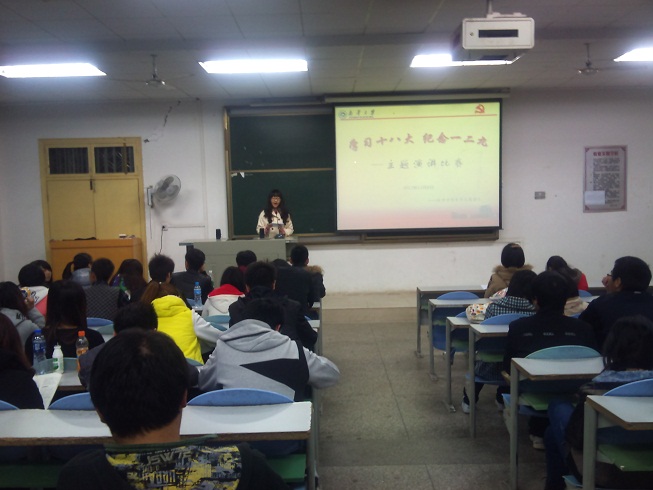 首先,一段回忆“一二九”运动的视频拉开了此次活动的序幕,接着一段动画PPT介绍了十八大召开的国际国内背景、十八大的主要议题及内容,然后十位来自不同班级的参赛选手依次登场,饱含激情的进行演讲。最后付云涛同学的《不朽的一二九》、徐伟迪同学的《怀颗爱国心,做个强国人》、李佳同学的《向12.9致敬》分别包揽此次演讲比赛的前三名。