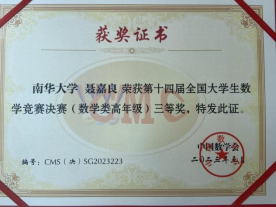 全国大学生数学竞赛是由中国数学会主办,面向全国本科学生的高水平学科竞赛。本次比赛初赛吸引了包括北京大学、清华大学、复旦大学在内的1000余所高校、逾23万学生参加。经过激烈角逐,聂嘉良同学以专业B组湖南省第一名的成绩入围全国决赛。