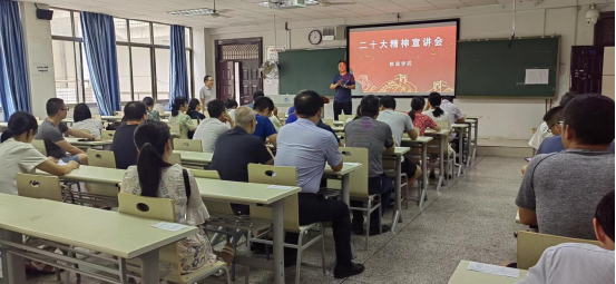 6月16日下午,数理学院在化工楼302教室举行党的二十大精神宣讲专题会。全院教职工及优秀学生代表参加会议,会议由院党委书记谭建国主持。