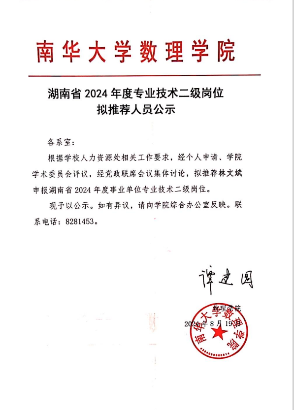湖南省2024年度专业技术二级岗位拟推荐人员公示
