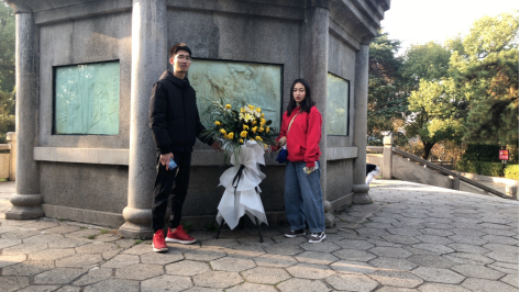 衡阳抗战纪念城碑周围,松柏苍翠、生机勃勃,首先班长朱江和团支书张丹代表全体同学表达对先烈们的缅怀并献上鲜花。摆放在石碑前的鲜花寄托着同学们对革命先辈们的怀念和尊重,全体同学都低下头进行深深的悼念。