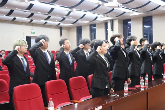 在吴庆林老师的带领下,新一届团学干部举起右拳,庄严宣誓。铿锵有力的誓言,表达了他们服务同学、奉献学院的坚定决心。